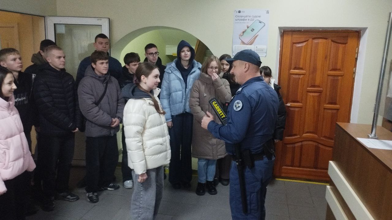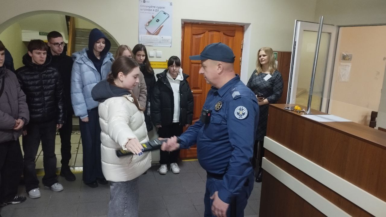 Зустріли учнів працівники служби судової охорони. Командир відділення м. Іллінці ст. сержант Служби судової охорони Андрій Білоконь ознайомив із порядком пропуску осіб до приміщення суду та роботою служби судової охорони.