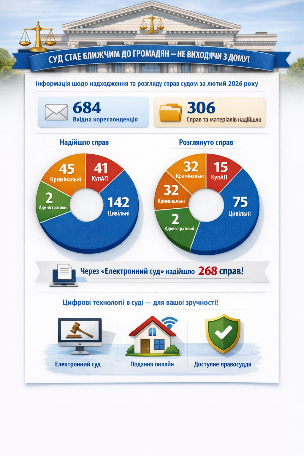 Інформація щодо надходження та розгляду справ судом за лютий 2026 р