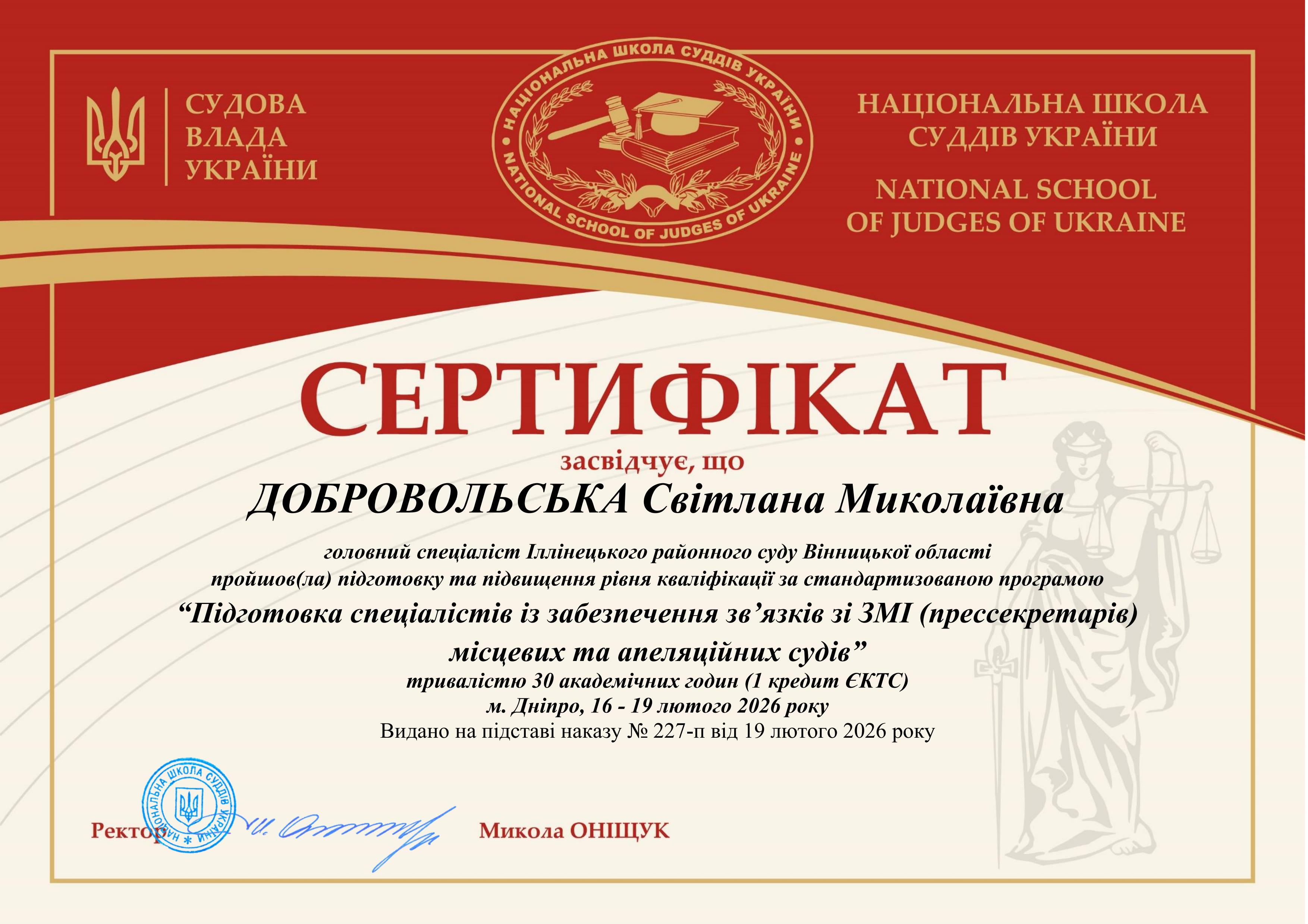 Консультант суду по роботі з персоналом взяла участь у навчанні на платформі Національної школи суддів України: «Підготовка спеціалістів із забезпечення зв’язків зі ЗМІ (прессекретарів) місцевих та апеляційних судів» (16-19 лютого 2026 року) та отримала відповідний сертифікат.