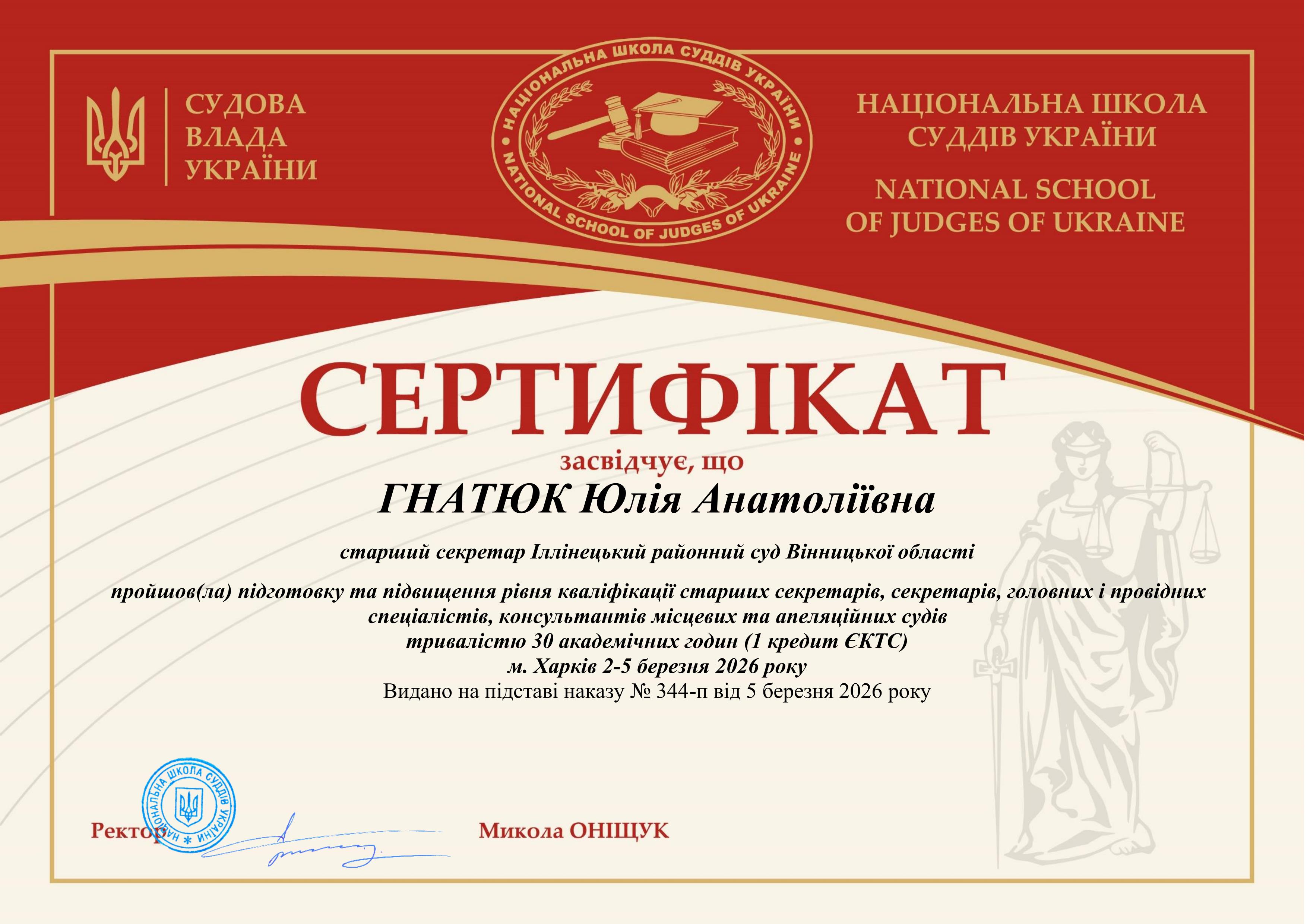 Старший секретар суду ГНАТЮК Юлія Анатоліївна пройшла підготовку та підвищення рівня кваліфікації старших секретарів, секретарів, головних і провідних спеціалістів, консультантів місцевих та апеляційних судів тривалістю 30 академічних годин (1 кредит ЄКТС) 2-5 березня 2026 року та отримала відповідний сертифікат.