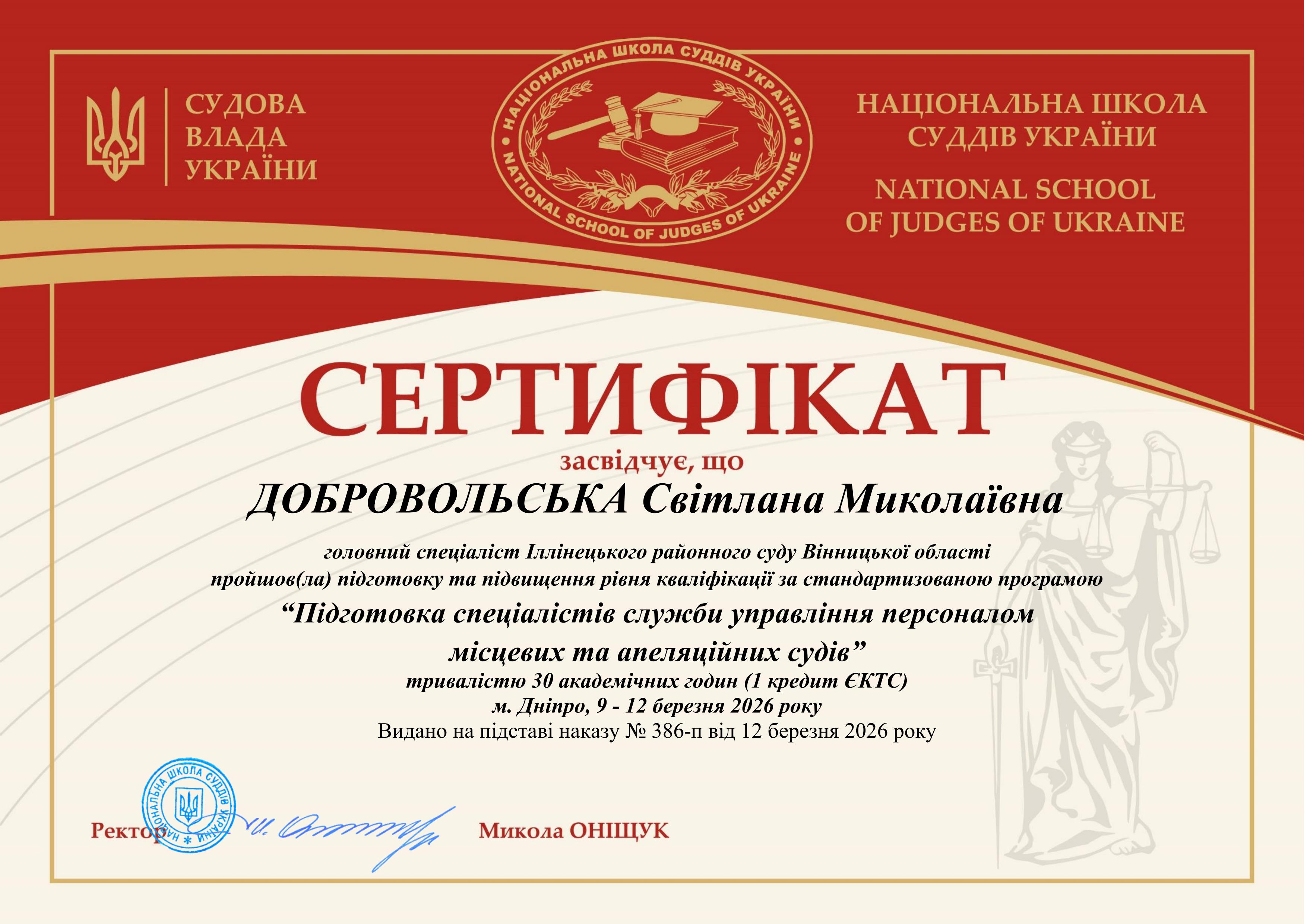 Консультант суду по роботі з персоналом ДОБРОВОЛЬСЬКА Світлана Миколаївна пройшла підготовку та підвищення рівня кваліфікації за стандартизованою програмою “Підготовка спеціалістів служби управління персоналом місцевих та апеляційних судів” тривалістю 30 академічних годин (1 кредит ЄКТС) 9 - 12 березня 2026 року та отримала відповідний сертифікат.